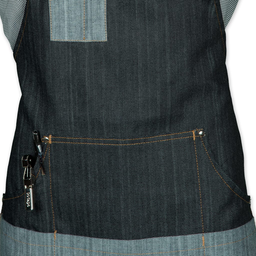Tissu denim bleu surpiqûres dorées : 97% coton / 3% élasthanne